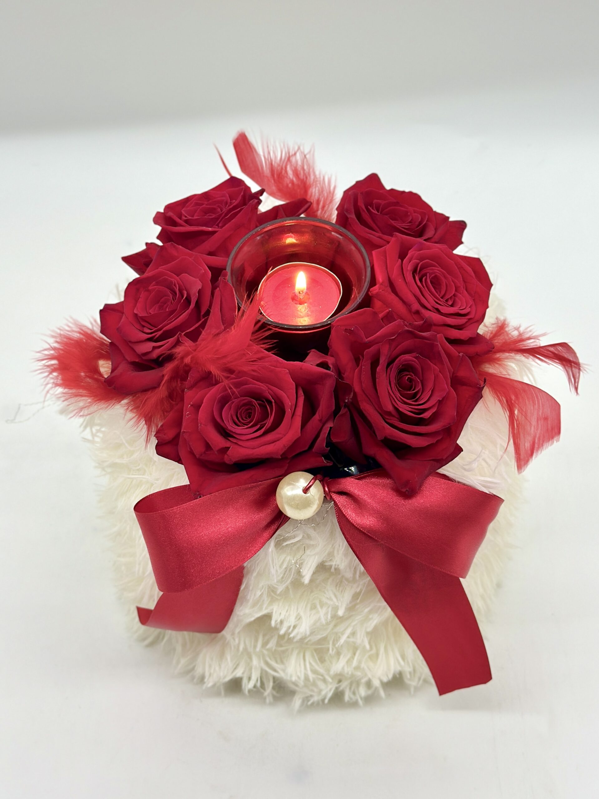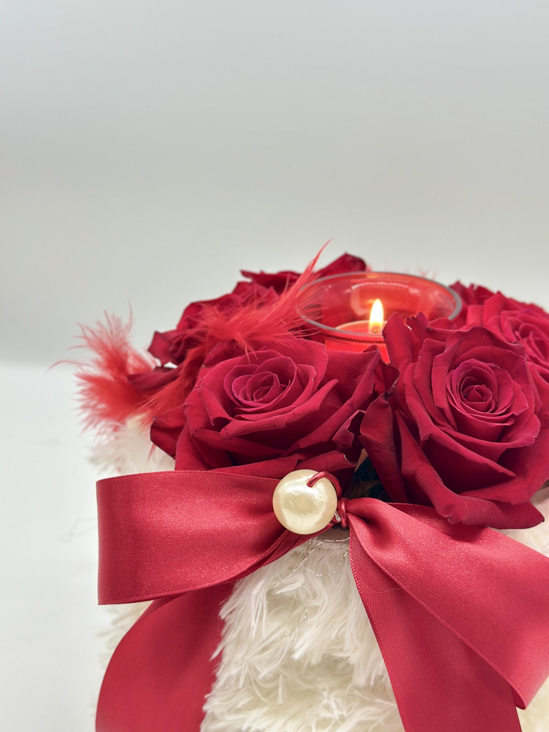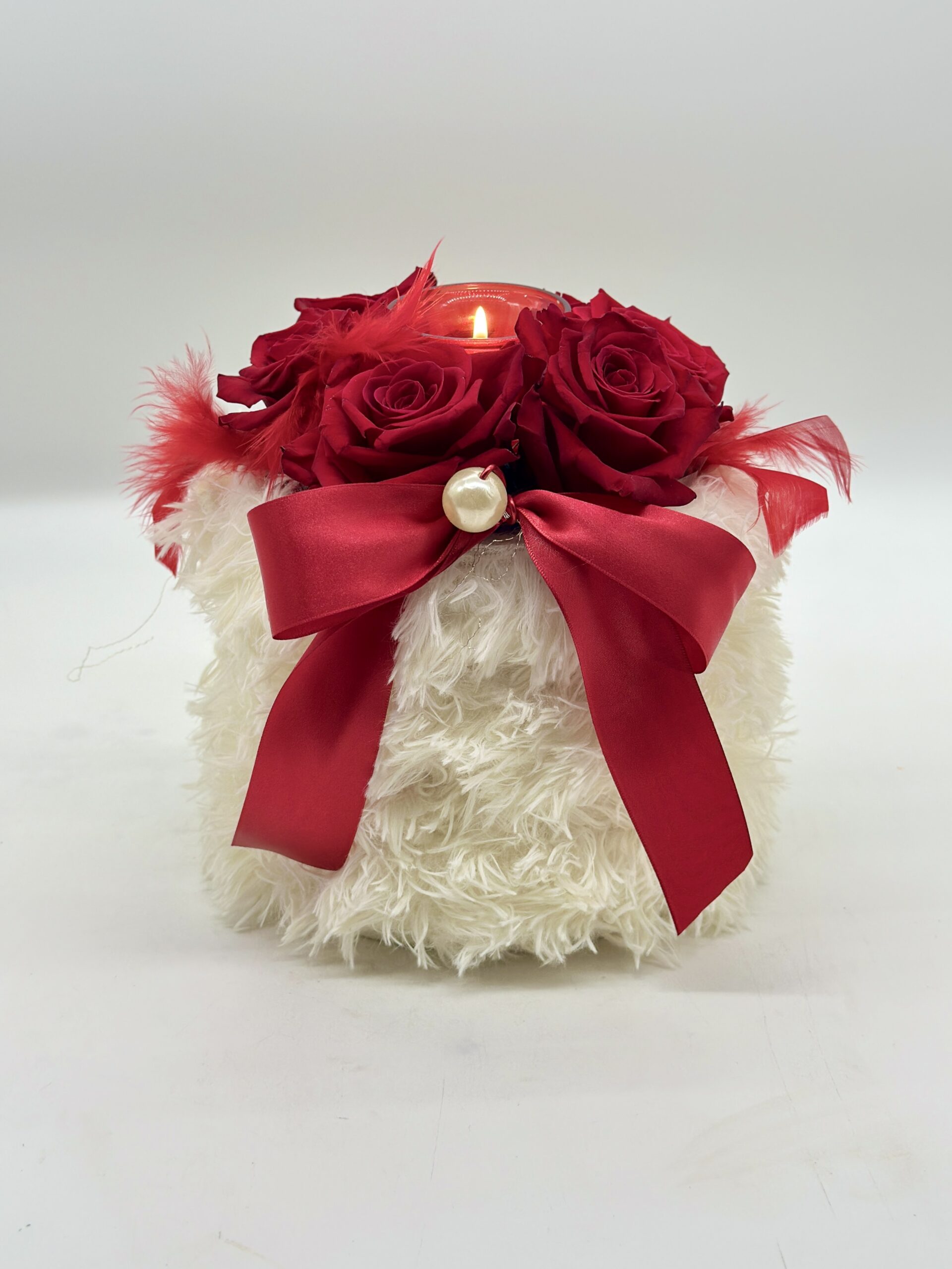 Winter handmade box with red roses and small candle.